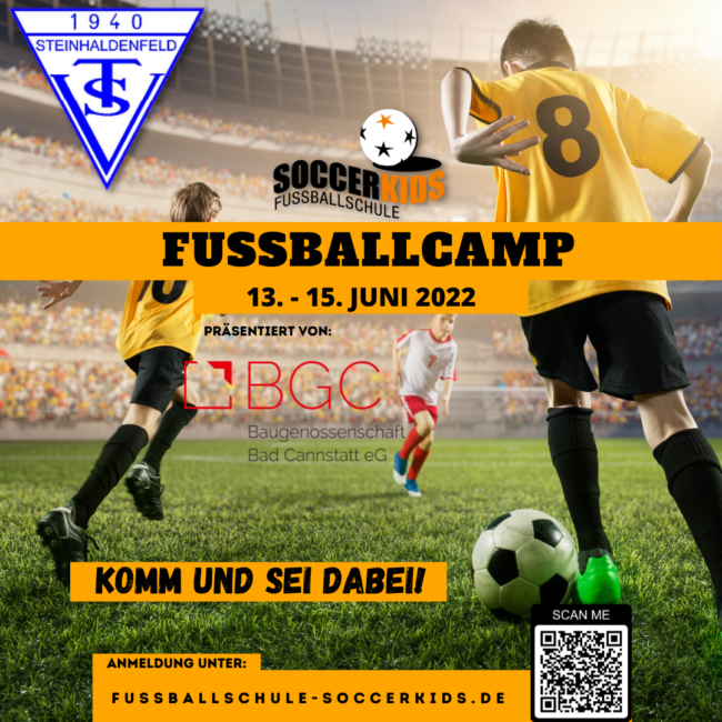 TSV STEINHALDENFELD CAMP⚽️ Vom 13. – 15.06.2022 findet das Fussballcamp beim TSV STEINHALDENFELD statt!🤩 Über den QR-Code gelangst du zur Anmeldung auf unserer Homepage😉 Wir freuen uns auf Dich!💪🏼 1 2 3SOCCERKIDS