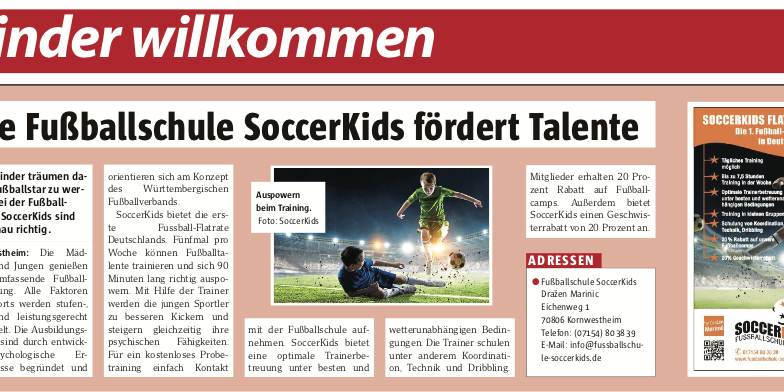 Nov.182019Uncategorized Die Soccerkids fördern Kinder. Anbei ein toller Bericht in der Presse von uns! Vielen Dank an die Kornwestheimer Zeitung! Kategorie: UncategorizedVon AdminNovember 18, 2019 Autor: Admin KommentarnavigationZurückVorheriger Beitrag:Newsletter NovemberNächstesNächster Beitrag:SOCCERKIDS NEWSLETTER NOVEMBER mit persönlichem GewinnRelated PostsÜber die Soccerkids zum VfB Stuttgart ⚽️Juli 16, 2025Profivertrag für Troy Tomsa!📝Februar 8, 2024Profivertrag für @mike.huras 😍📝Januar 18, 2024Prominenter BesuchDezember 18, 2023Jan Carlo Simic mit TraumdebütDezember 18, 2023Troy von Sassuolo Calcio im Einzeltraining ⚽️November 24, 2023
